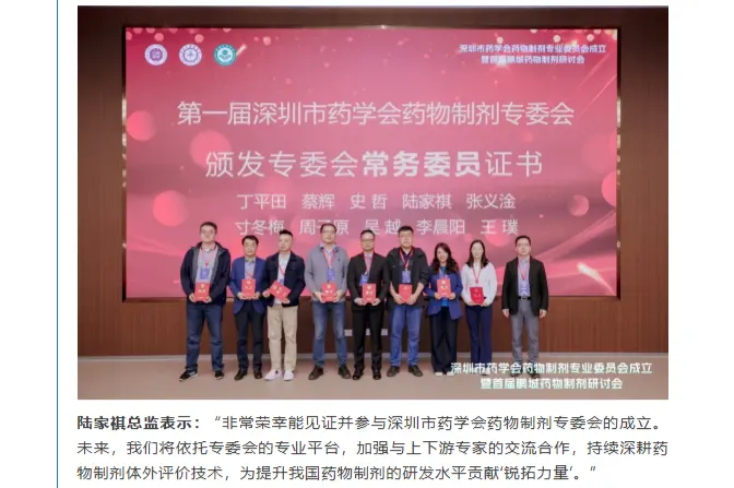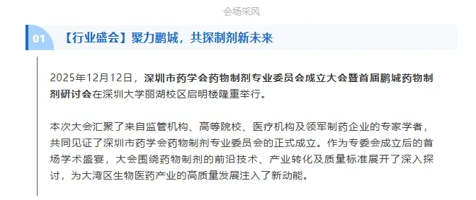 2025年12月12日,深圳市药学会药物制剂专业委员会成立大会暨首届鹏城药物制剂研讨会在深圳大学丽湖校区启明楼隆重举行。