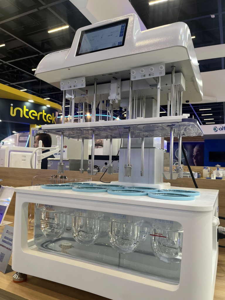 在 Allcrom 的 B065 展位上,锐拓仪器的核心产品 RT600 溶出仪成为了当之无愧的焦点。