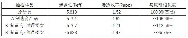 已通过一致性评价的B制造商过评批次,虽然临床BE试验达标,但其体外渗透性特征与原研存在显著差异(+12.5%)。