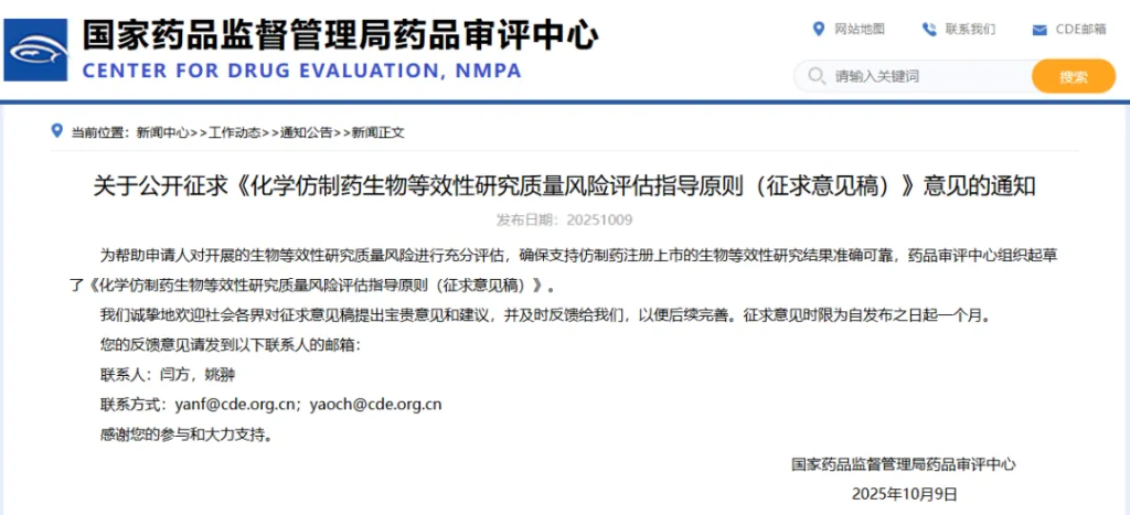 生物等效性研究是仿制药和参比制剂能否相互替换使用的重要依据,为此国家药监局在10月9号发布了相关质量风险评估的指导原则。