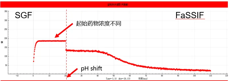 在案例中,NCE DP展示pH shift 模型的运用,这种模型用于研究BCS2类碱性药物在人体的沉淀效应。许多原研药物都采用了SDDS(过饱和载药系统)构建制剂,其在人体维持过饱和的能力决定了药物在人体内的BE等效的可能性。擅自增加剂量有可能加剧了药物在人体内的成核作用,使其沉淀更快,吸收更差。pH shift模型模拟了药物在人体GI中运动的过程,以体外方式提供了一种廉价而准确的人体模拟方案,为制剂学家筛选合适的药物剂量以及筛选抑制药物过饱和沉淀效应的辅料提供了一种可重复的,高通量的工具。