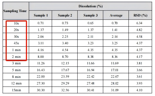流池法测试中:锐拓RT7流池法支持秒级密集取样(精准捕捉快速释现象),我们得以获得该电子烟中尼古丁在2min前的释放数据,溶出数据提示,在流池法平缓的剪切力环境下,尼古丁释放稍慢(15min平均释放量31.09%),相对标准偏差在3.61%-6.34%。