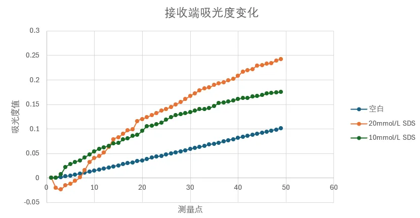 图1 利用光纤检测接收端中药物浓度的变化,结果如图1,2所示,不加辅料,加10mmol/L 的SDS以及20mmol/L 的SDS测得药物的有效渗透率(Peff)依次为-5.56、-5.166、-4.993。首先检测不加辅料的接收端药物浓度变化,结果如图1,随后将3种试验结果放在一起进行分析比较,结果如图2。可以看出辅料SDS能够使该BCS3类药增大渗透,且其渗透率增加与SDS浓度呈正相关,在药物使用者安全的条件下,辅料SDS添加越多越好。但是药物渗透率的增加量,跟SDS浓度相比增加并不是成比例的增加,这暗示辅料对于药物的促渗作用会有一个最佳值,需要通过高通量筛选来得到最佳辅料浓度。