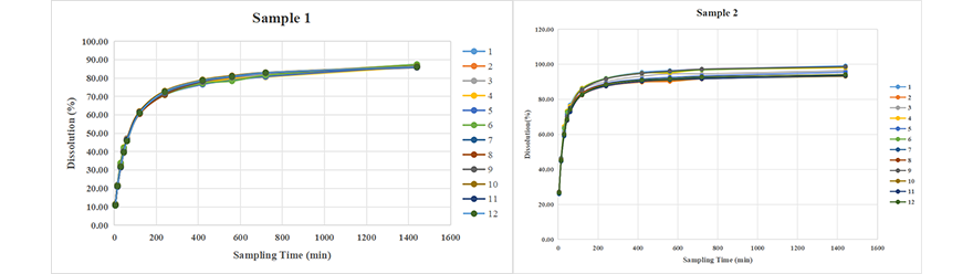 ②鉴别性:在该溶出方法下,样品1与样品2的体外释放行为存在显著差异,说明该方法对样品1和样品2具有良好的鉴别能力。
